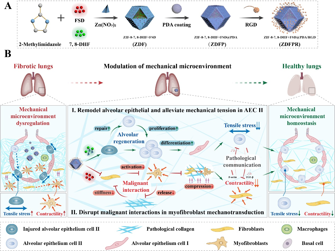 特发性肺纤维化是一种进行性且致命的肺部疾病,其进展受损伤性机械力的影响,最终破坏肺部机械微环境的稳态,导致肺泡功能障碍并进一步加重病情。由于纤维化肺部固有的机械敏感特性,II型肺泡上皮细胞会受到持续拉伸,过度活化的肌成纤维细胞在机械转导过程中也会形成恶性互作。针对这一问题,该团队设计并合成了环状RGDfC肽修饰的沸石咪唑酯骨架纳米颗粒(ZDFPR NPs),旨在修复病理状态下肺部异常的机械力水平(图1)。一方面,ZDFPR NPs通过促进肺泡的修复和分化,有效降低了II型肺泡上皮细胞的机械张力;另一方面,它能够破坏肌成纤维细胞收缩性与细胞外基质刚度之间的恶性循环。最终,该系统成功恢复了博莱霉素诱导纤维化小鼠的肺部力学稳态,终止了纤维化的进程。
